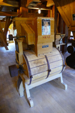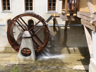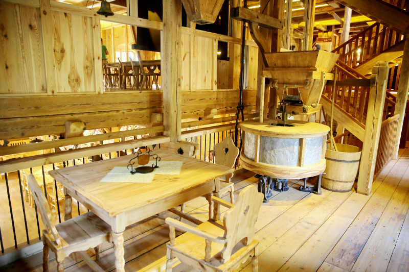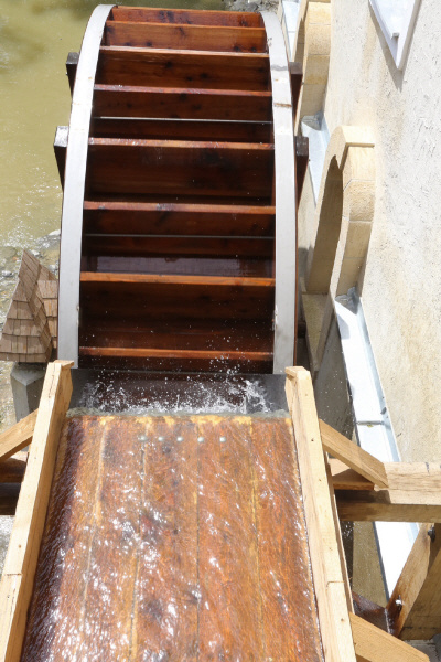 Bis 1940 wurde mit solchen Mühlen gemahlen. Ein Wasser- oder Windrad treibt einen Mühlstein an.