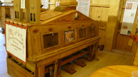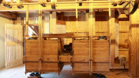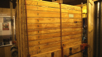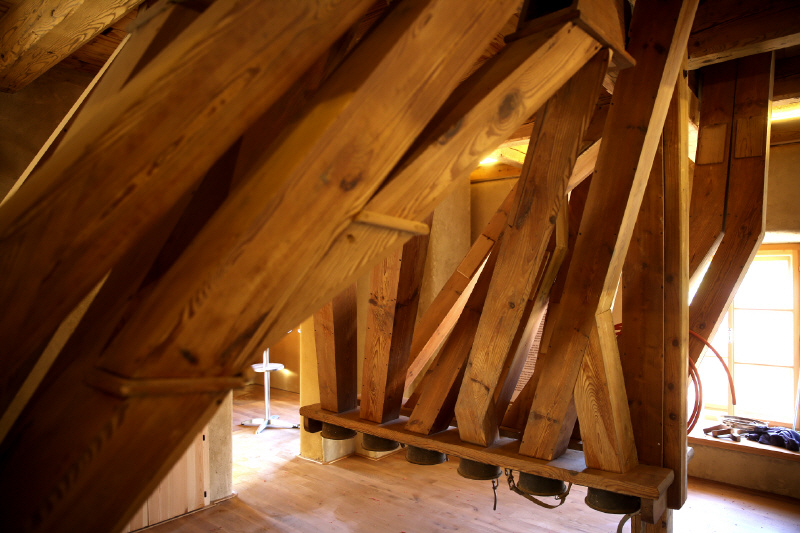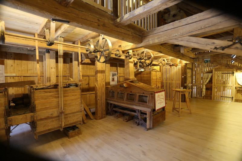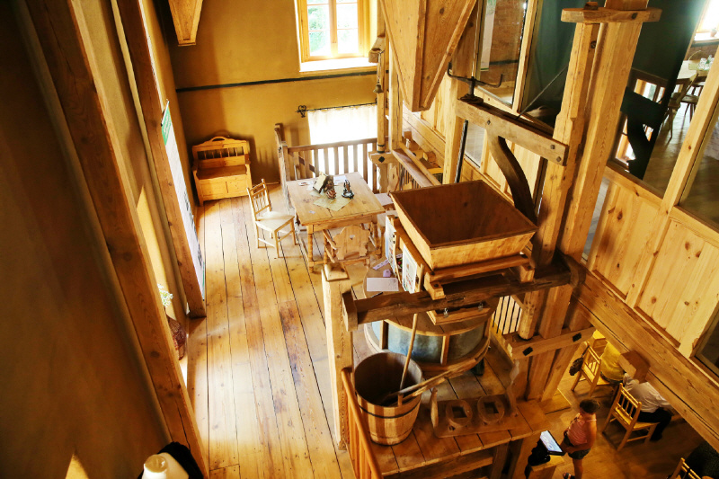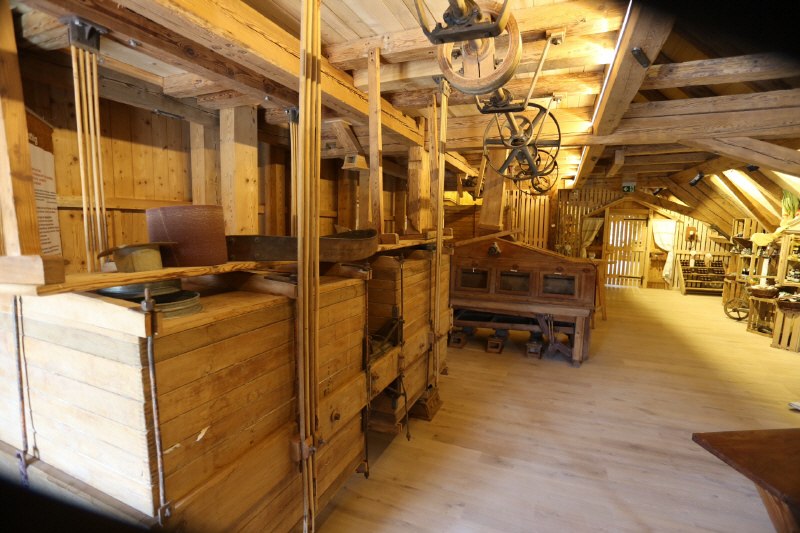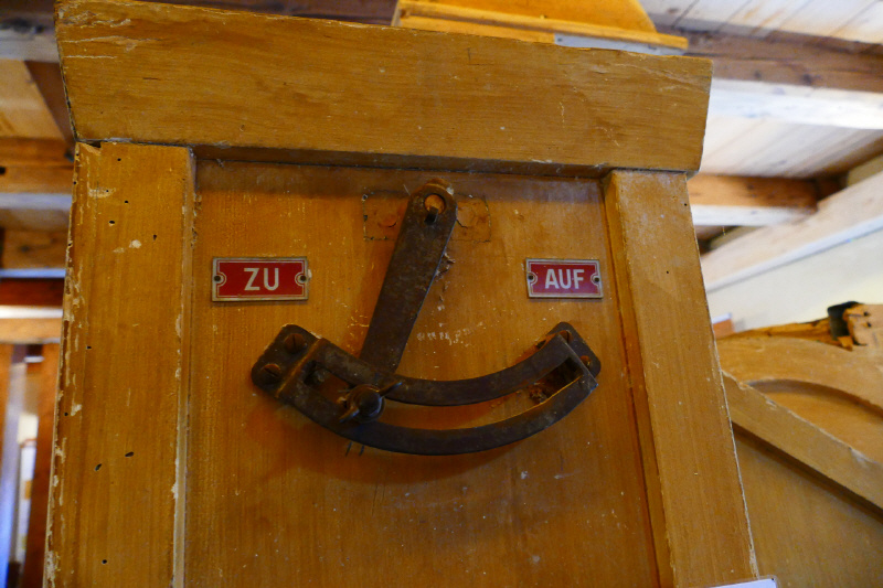 Durch diese Holzschächte kommt das fertige Mehl aus den unterschiedlichen Getreidesorten, in verschiedenen Mahlgraden und in mehreren Typen zur Abfüllung in Säcke.