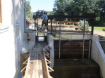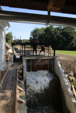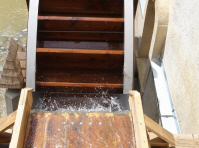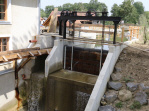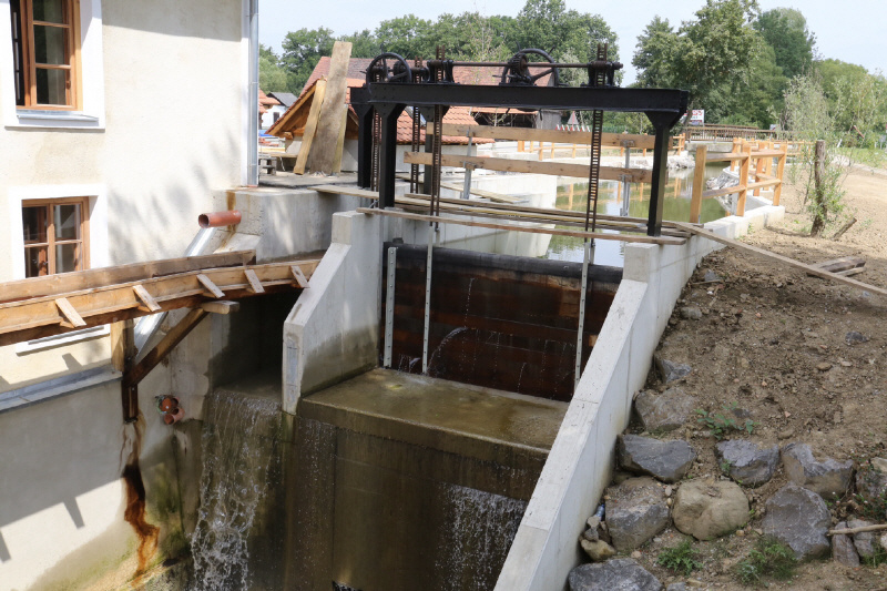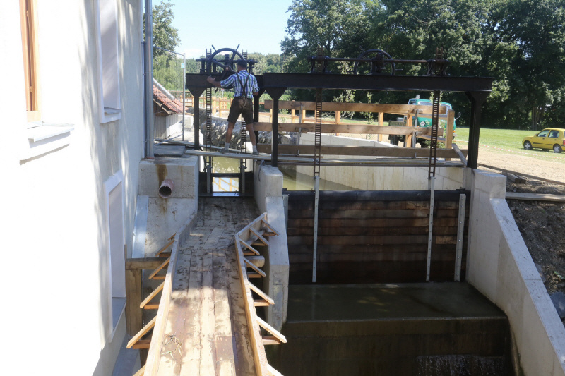Die Wehr befindet sich wenige Meter vor dem Haus und dient der Regulierung der zuströmenden Wassermenge. Der letzte Teil des Kanals vor dem Rad wird Gerinne genannt. Am Gerinne ist ein Freifluter, auch Leerschuss genannt, angebracht, welcher bei Stillstand des Wasserrades das Wasser am Rad vorbeileitet.
