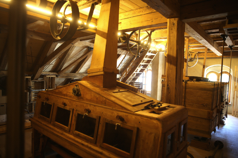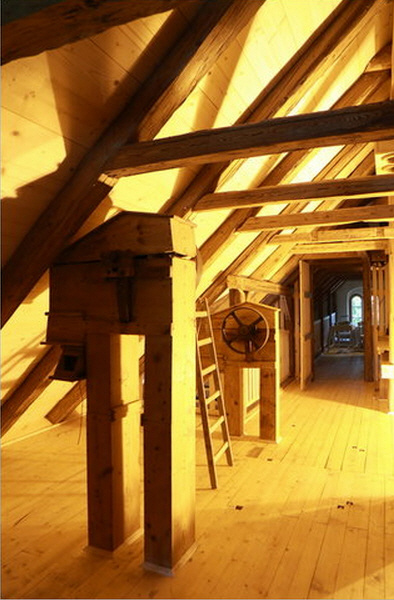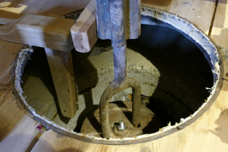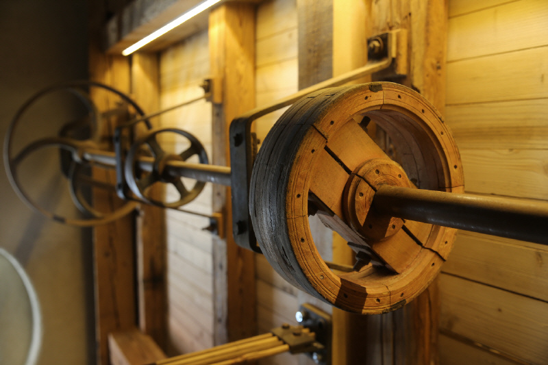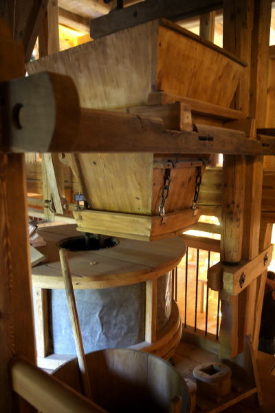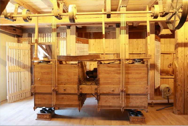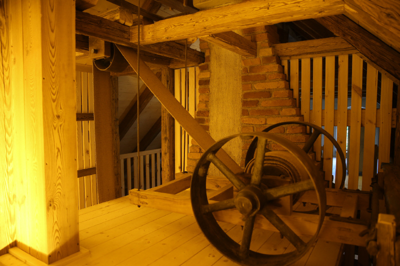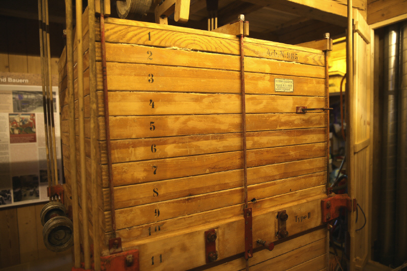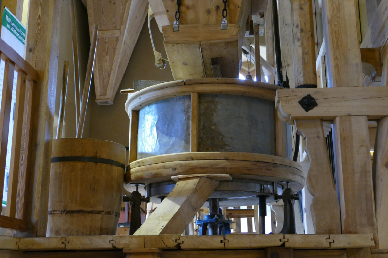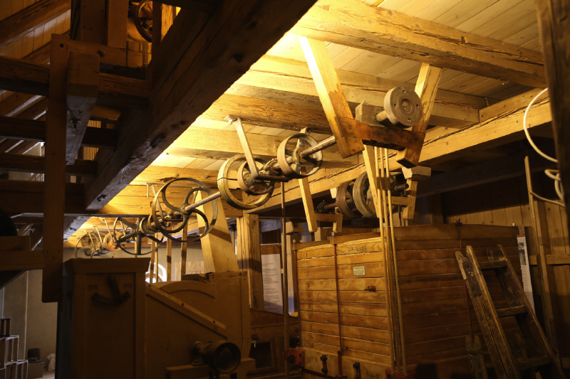 Das Becherwerk funktioniert nach dem Paternostersystem. Diese Erfindung um 1790 erlöste den Müller vom Säcke schleppen. Die ersten Becher bestanden aus Leder, ab 1860 aus Blech.
