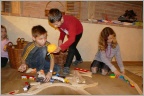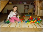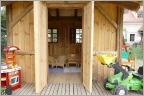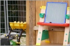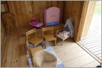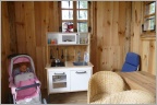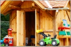 Im Häuschen gibt es außerdem noch Sandspielzeug, Puppen, eine Kochnische, Geschirr, Kinderstühle, einen Bagger, eine große Zeichentafel, Federballschläger, Bälle und noch viele andere interessante Spielsachen.
